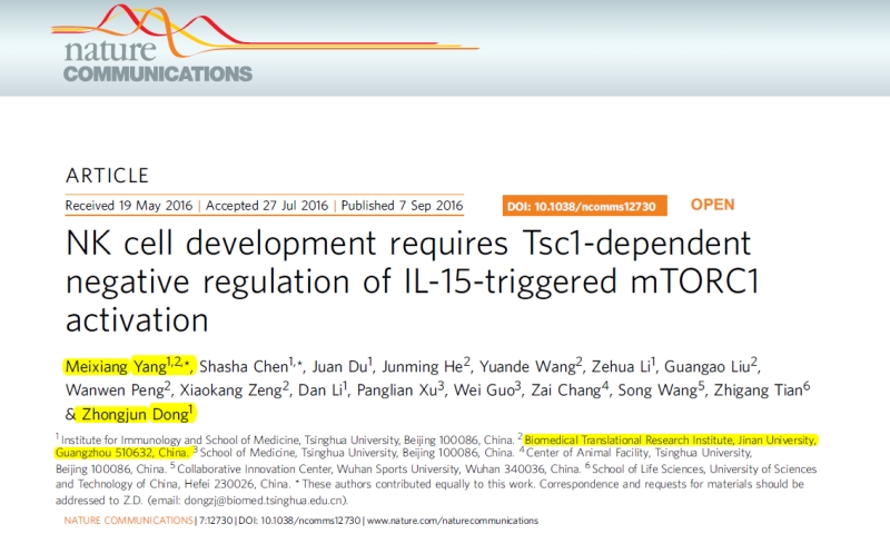一个月之内,两课题组再次发力。9月7日杨美香以第一作者在《Nature》子刊《Nature Communications》上发表题为“NK cell development requires Tsc1-dependent negative regulation of IL-15-triggered mTORC1 activation”的研究论文。该研究揭示了一种NK细胞早期发育的负反馈调节机制。这是继董忠军课题组在《Journal of Experimental Medicine》上揭示IL-15通过激活mTOR信号诱导NK细胞特异性转录因子E4BP4表达的正反馈调节环路之后,在NK细胞发育调控机制领域又一重要发现。