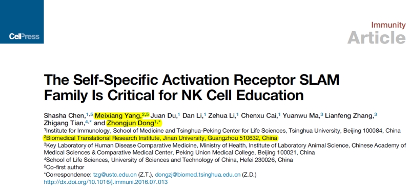 8月9日,我校生物医学转化研究院杨美香课题组与清华大学免疫学研究所董忠军课题组在免疫学顶尖杂志《Immunity》发表题为“The Self-Specific Activation Receptor SLAM Family Is Critical for NK Cell Education”高水平论文,我校杨美香研究员为该论文的共同第一作者。该文首次发现造血细胞特异性SLAM 家族受体作为自身特异性活化型受体参与自然杀伤细胞活化和耐受的调节,揭示了一种新的NK细胞功能获得机制。