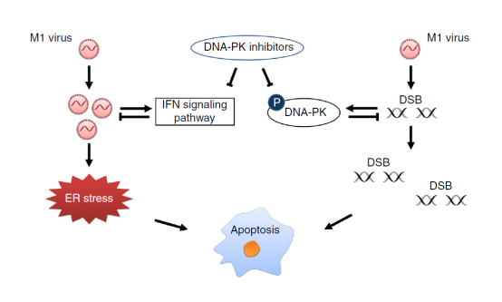 该研究通过小分子抗癌化合物库筛选发现,一种靶向DNA-PK(DNA依赖性蛋白激酶)的小分子化合物能够显著增强耐药肿瘤细胞对新型溶瘤病毒M1的敏感性。研究显示,靶向抑制DNA-PK是通过双重机制来增强溶瘤病毒M1对耐药肿瘤细胞的杀伤作用。首先,抑制DNA-PK可以在耐药肿瘤细胞中阻断IFN抗病毒通路,促进M1病毒在瘤内复制,触发剧烈内质网应激;其次,溶瘤病毒M1可以引起肿瘤细胞的DNA损伤,而DNA-PK抑制剂则进一步限制了肿瘤细胞的DNA损伤修复功能,导致DNA损伤无法及时修复,诱发细胞凋亡(见下图)。基于溶瘤病毒M1和DNA-PK抑制剂的联合疗法,在多个体内肿瘤模型和患者来源的肿瘤样本中表现出优异的肿瘤抑制效应。这一研究为溶瘤病毒疗法的耐药性提供了一种合理的解决方案,并建立了一种新型的“小分子化合物-生物制剂”的肿瘤联合疗法。