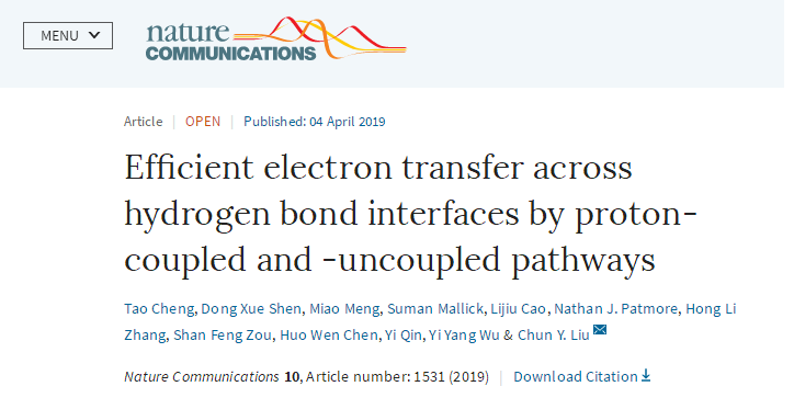 近日,化学与材料学院刘春元教授课题组在Nature子刊Nature Communications(IF:12.353)上发表了题为“Efficient electron transfer across hydrogen bond interfaces by proton-coupled and -uncoupled pathways”的原创性研究论文,我校为第一完成单位,刘春元教授为唯一通讯作者。