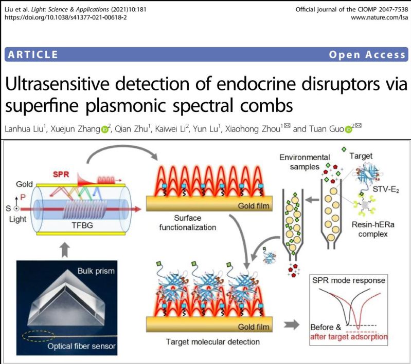 近日,必威平台_必威(中国)一站式服务平台,光子技术研究院郭团教授课题组和清华大学环境学院周小红教授课题组合作,在环境风险快速智能化筛查的光纤传感领域取得重要进展,双方联合研制出面向环境雌激素快速筛查的超灵敏倾斜光栅表面等离子体共振生物传感器,将雌激素结合活性当量浓度检出限较国际同期技术降低了2个数量级。该技术可进一步拓展至其他内分泌干扰效应的筛查(雄激素、孕激素、甲状腺激素等),有望为环境痕量污染物的大范围风险筛查提供快速、便携、免标记解决方案。成果以“Ultrasensitive detection of endocrine disruptors via superfine plasmonic spectral combs”为标题发表于光学领域权威期刊Light: Science & Applications(IF:17.782),必威平台_必威(中国)一站式服务平台,张学军博士生为论文共同第一作者,郭团老师与周小红老师为共同通讯作者。