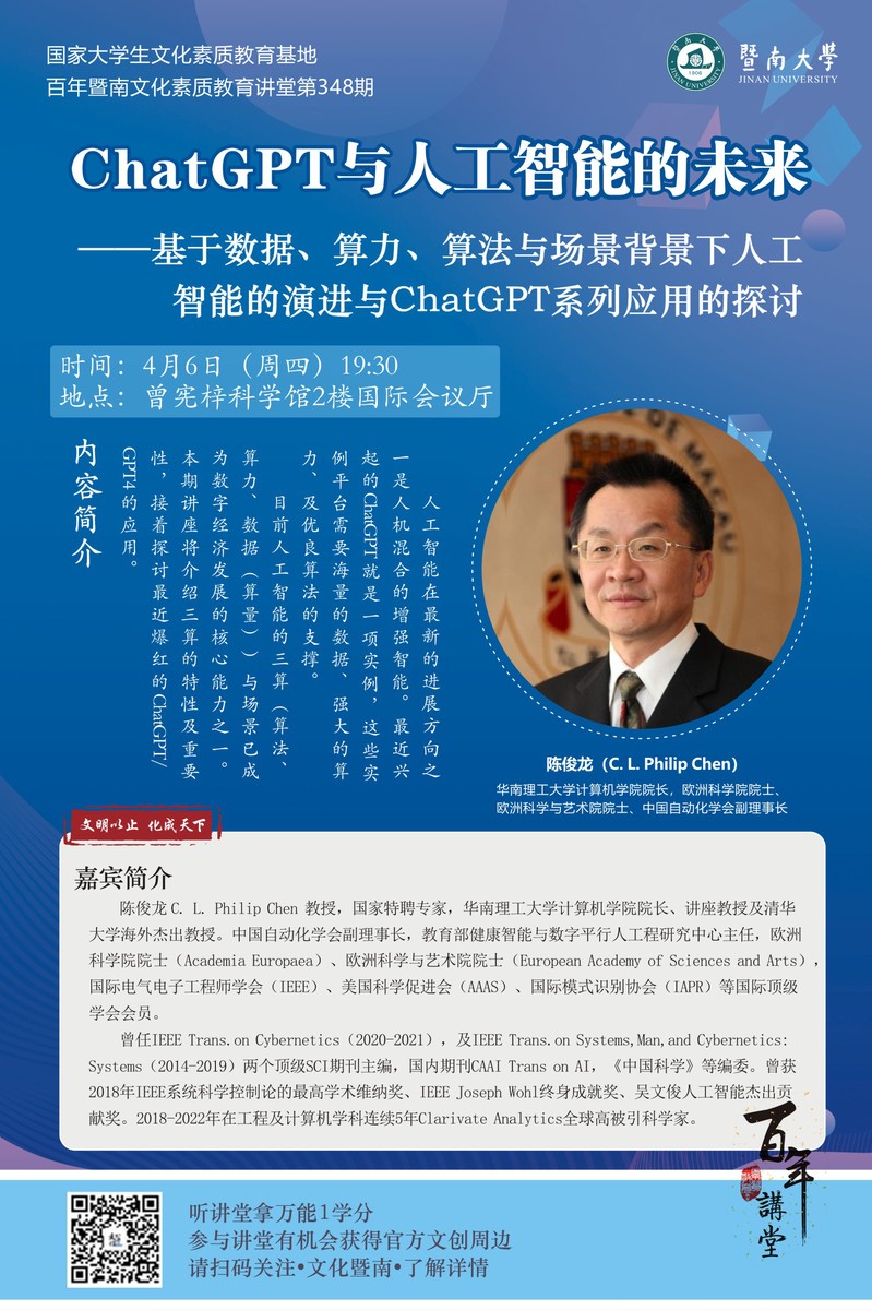 百年暨南文化素质教育讲堂第348期:陈俊龙:ChatGPT与人工智能的未来 ——基于数据、算力、算法与场景背景下人工智能的演进与ChatGPT系列应用的探讨