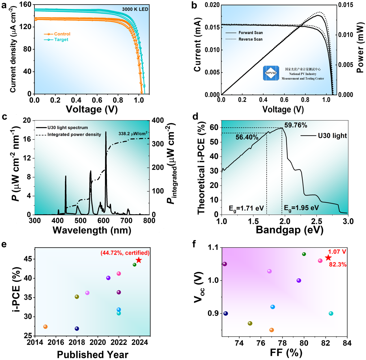 此外,经国家光伏产业计量测试中心认证,在室内光源(U30 1000 Lux 338.2 µWcm–2)照射下,宽带隙钙钛矿太阳电池获得了44.72%的认证记录效率,以及1.07V的高开路电压和82.3%的填充因子(图2),均为当前已报道的世界最高值。这是该课题组继大面积(12.96 cm2)钙钛矿室内组件43.54%的转换效率报道之后(Device, 2023, 1, 100174),再一次取得的效率突破。