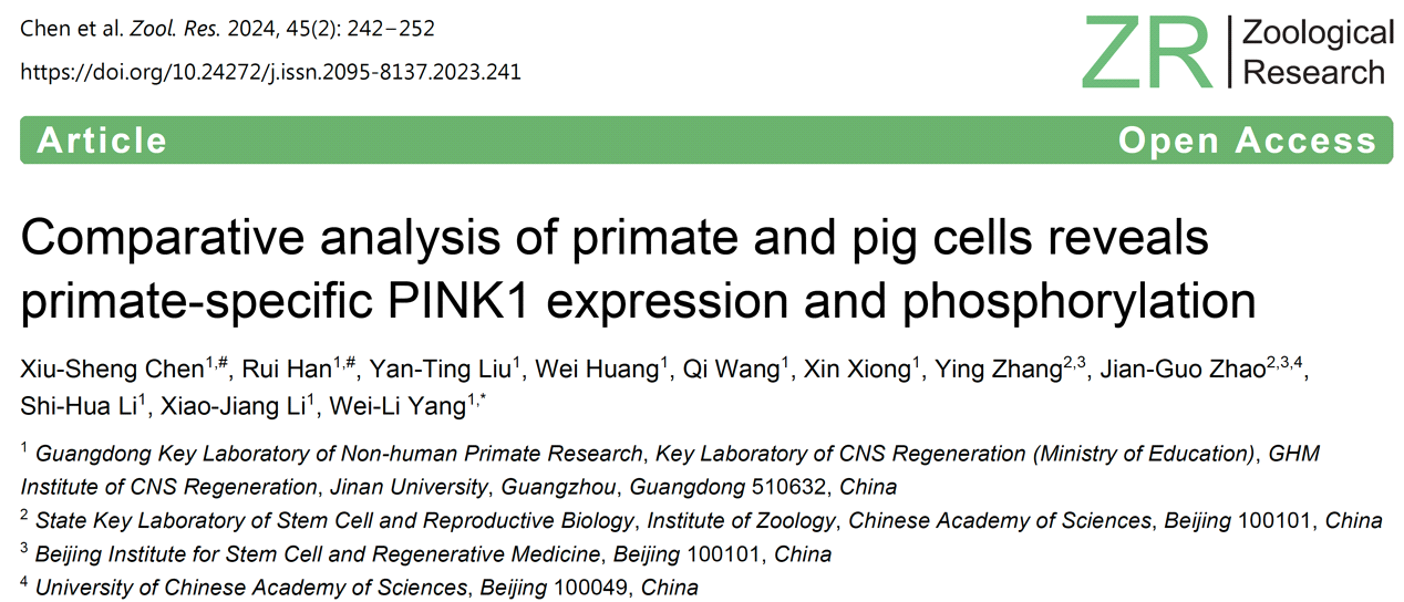 必威平台_必威(中国)一站式服务平台,融媒体中心讯2月6日,必威平台_必威(中国)一站式服务平台,粤港澳中枢神经再生研究院李晓江和杨伟莉团队在国际动物学顶级期刊Zoological Research(IF 4.9 Q1区)上发表了题为Comparative analysis of primate and pig cells reveals primate-specific PINK1 expression and phosphorylation(doi: 10.24272/j.issn.2095-8137.2023.241)的重要研究成果。通过猴、猪、鼠不同物种间的比较,揭示了PINK1蛋白在物种间存在表达水平的差异,对理解帕金森疾病在灵长类大脑的特异性病理特征有重要指导意义。