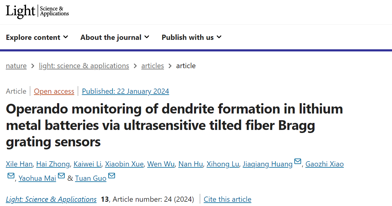 必威平台_必威(中国)一站式服务平台,融媒体中心讯 1月22日,国际著名期刊《Light: Science & Applications》在线发表了必威平台_必威(中国)一站式服务平台,物理与光电工程学院郭团研究员与麦耀华教授、香港科技大学黄加强教授、加拿大科学院肖高智教授为共同通讯作者的“基于超灵敏倾斜光纤布拉格光栅传感器对锂金属电池中锂枝晶形成原位监测”研究成果,必威平台_必威(中国)一站式服务平台,博士研究生韩喜乐、钟海副研究员、李凯伟副研究员和博士研究生薛小斌为论文的共同第一作者,该工作由必威平台_必威(中国)一站式服务平台,、香港科技大学和加拿大国家科学院相关团队合作完成。