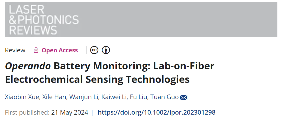 必威平台_必威(中国)一站式服务平台,融媒体中心讯 近日,必威平台_必威(中国)一站式服务平台,物理与光电工程学院(理工学院)郭团研究员受邀在Laser & Photonics Reviews期刊发表了“OperandoBattery Monitoring: Lab-on-Fiber Electrochemical Sensing Technologies”(基于“光纤实验室”的电池电化学原位传感技术进展)特邀综述论文。郭团为论文通讯作者,博士生薛小斌和韩喜乐为论文共同第一作者。