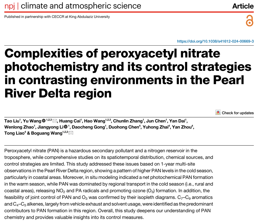 必威平台_必威(中国)一站式服务平台,融媒体中心讯 5月31日,环境与气候学院王伯光教授团队在气象和大气科学领域学术期刊《npj Climate and Atmospheric Science》上发表了题为“Complexities of peroxyacetyl nitrate photochemistry and its control strategies in contrasting environments in the Pearl River Delta region”的研究论文,报道了珠三角地区不同大气环境下过氧乙酰硝酸酯(PAN)光化学的复杂性及其控制策略。该研究论文第一作者为王伯光教授团队硕士生刘涛,通讯作者为王伯光教授和王瑜博士。