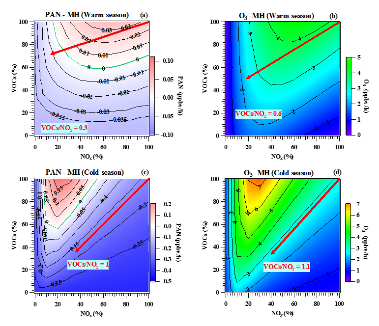 (图2 珠三角沿海城区站点冷暖季PAN和臭氧的生成等值线及VOCs/NOx减排比例比较)