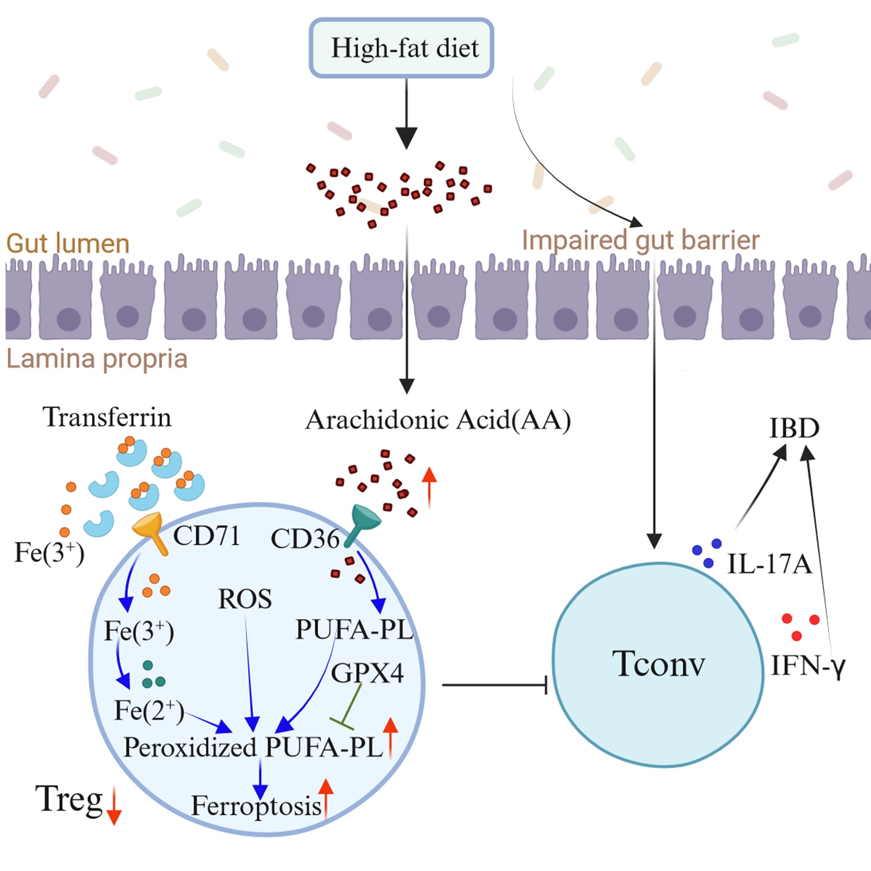 近年来的研究发现,HFD还会引起肠道组织Treg细胞(发挥免疫抑制功能的关键细胞之一)比例与数量的显著下调,是机体免疫抑制能力衰减的重要表现;但是HFD导致Treg细胞数量减少的原因尚未完全解析。2024年8月16日,我校生物医学转化研究院与药学院合作,在《Cell Reports》杂志发表了题为“Inherent preference for polyunsaturated fatty acids instigates ferroptosis of Treg cells that aggravates high fat diet related colitis”的研究论文。该研究发现,Treg细胞具有偏好使用多不饱和脂肪酸(polyunsaturated fatty acids,PUFAs)来合成细胞膜磷脂的固有属性,导致其细胞膜更容易被脂质过氧化,引发铁死亡,进而导致Treg细胞数量减少、免疫抑制功能降低。而西式饮食结构或HFD中含有高丰度的PUFAs(如花生四烯酸,arachidonic acid,AA),因此,大量脂质摄入引起Treg细胞铁死亡,进而导致免疫抑制功能下降,不能有效抑制肠炎。