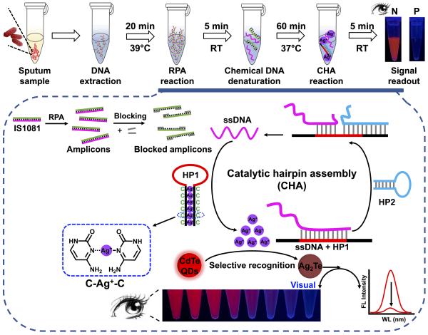 在本研究中,团队采用基于重组酶聚合酶扩增(RPA)-催化发夹自组装(CHA)双重信号放大策略,开发了一种灵敏、低成本的结核病即时检测(POCT)平台。该平台利用量子点信号探针实现了结核病的可视化诊断,目测分析的检测限低至0.33 amol/L。该方法成功应用于多例结核病患者和健康人的痰液样本检测,检测结果与qPCR方法高度一致。本研究建立的方法具有灵敏度高、特异性强、操作简单、成本低等优点,有望应用于临床结核病的筛查和诊断。
