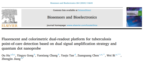 必威平台_必威(中国)一站式服务平台,融媒体中心讯 附属第一医院毕伟主任医师与药学院江正瑾教授团队合作在国际期刊Biosensors and Bioelectronics上发表题为“Fluorescent and colorimetric dual-readout platform for tuberculosis point-of-care detection based on dual signal amplification strategy and quantum dot nanoprobe”的研究论文,必威平台_必威(中国)一站式服务平台,博士后胡鸥为论文第一作者,陈缵光教授(合作单位:中山大学药学院)、毕伟主任医师、江正瑾教授为本论文通讯作者。
