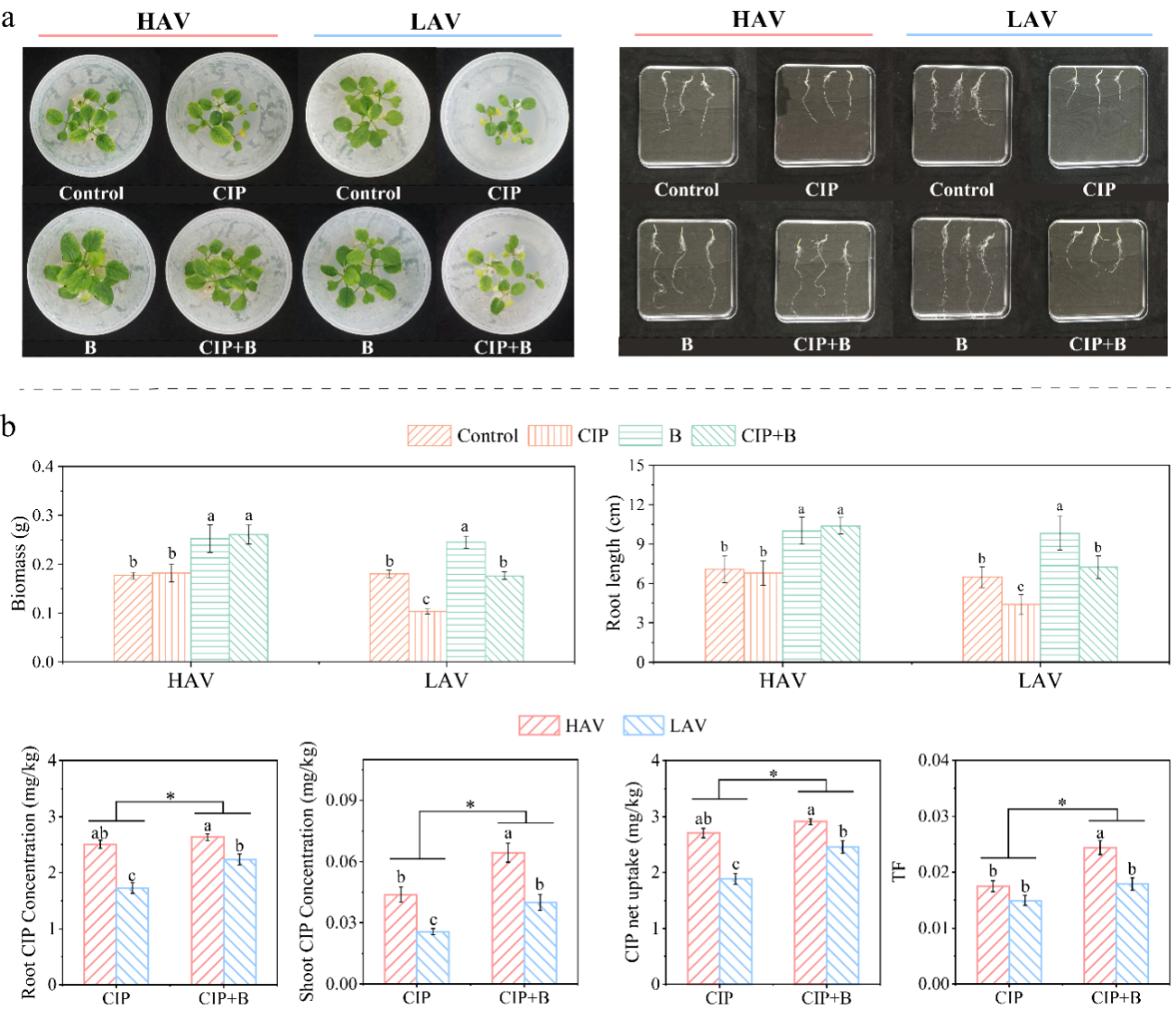 抗生素在人类医疗、农业养殖等领域广泛使用,导致其大量进入环境成为新污染物,在农田土壤中普遍检出,并易被农作物吸收累积,严重威胁农产品安全和人体健康。筛选和种植污染物低累积作物品种是保障污染土壤安全利用并同步修复的重要策略。该研究团队针对珠三角地区农田环境中典型抗生素环丙沙星(CIP)和代表性叶菜类作物菜心,率先筛选获得了其低累积品种(LAV),初步揭示了该低累积作物品种的生理生化与分子机制。同时发现,微生物在作物吸收累积污染物过程中也发挥重要作用,但对于关键微生物及其作用过程与调控机制仍未明确。