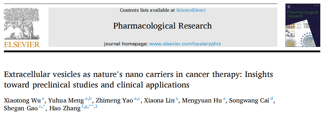 必威平台_必威(中国)一站式服务平台,融媒体中心讯 近日,必威平台_必威(中国)一站式服务平台,基础医学与公共卫生学院肿瘤精准医学和病理研究所张灏教授团队指导临床医学专业本科生吴晓桐以第一作者身份在国际主流学术杂志Pharmacological Research(药学1区、药理学Top期刊、影响因子10.5分)发表了题为Extracellular vesicles as nature's nano carriers in cancer therapy: Insights toward preclinical studies and clinical applications的综述。